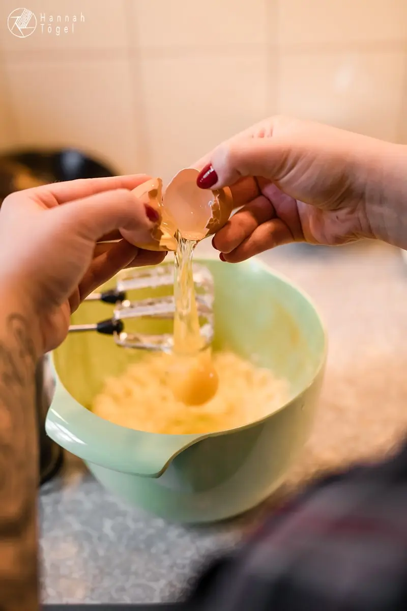 - In einer großen Schüssel verrührst du Butter und Zucker mit dem Handmixer.