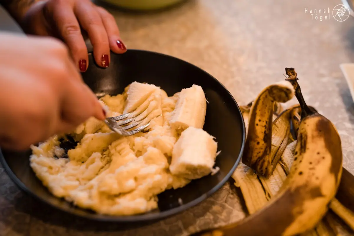 - Ich zerdrücke die Bananen mit der Gabel, bis sie komplett matschig sind. Möchte man aber gerne Stückchen im Kuchen haben, reicht es, sie kurz zu zerteilen und mit kleinen Bröckchen beizumengen.
