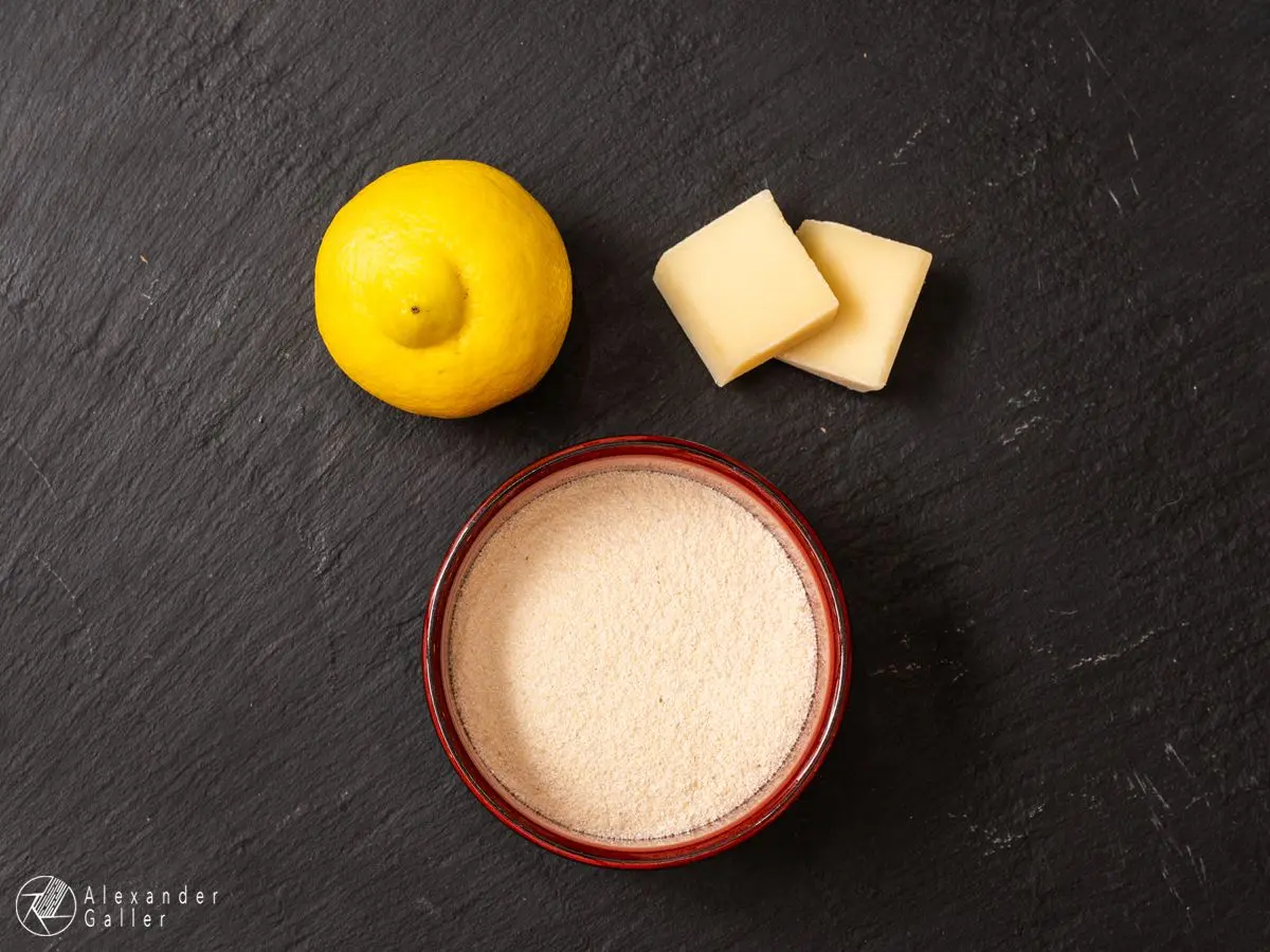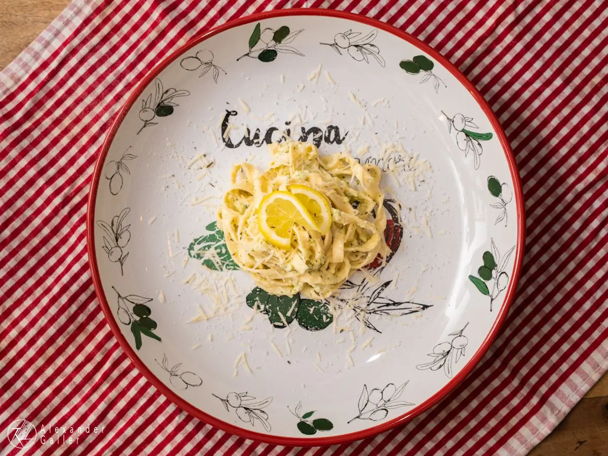 Mit Parmesan, sowie einer Scheibe Zitrone anrichten und schmecken lassen!