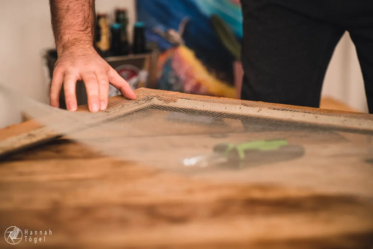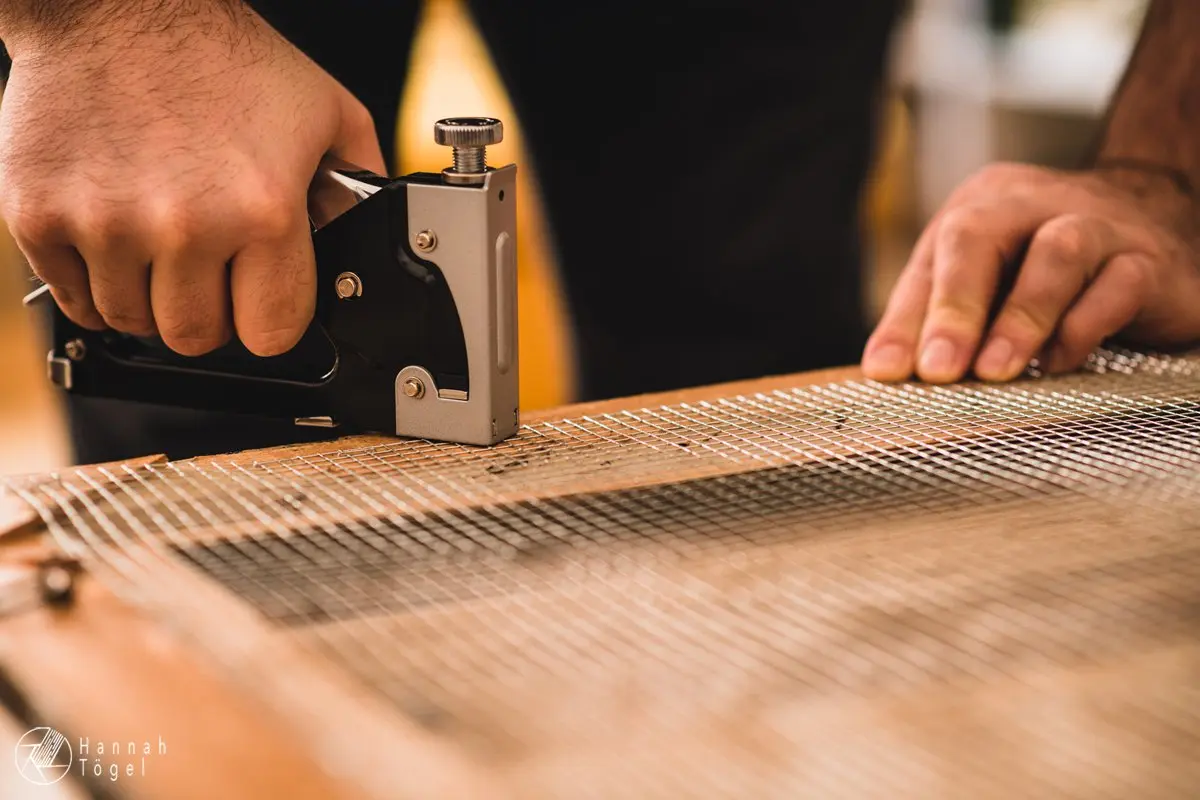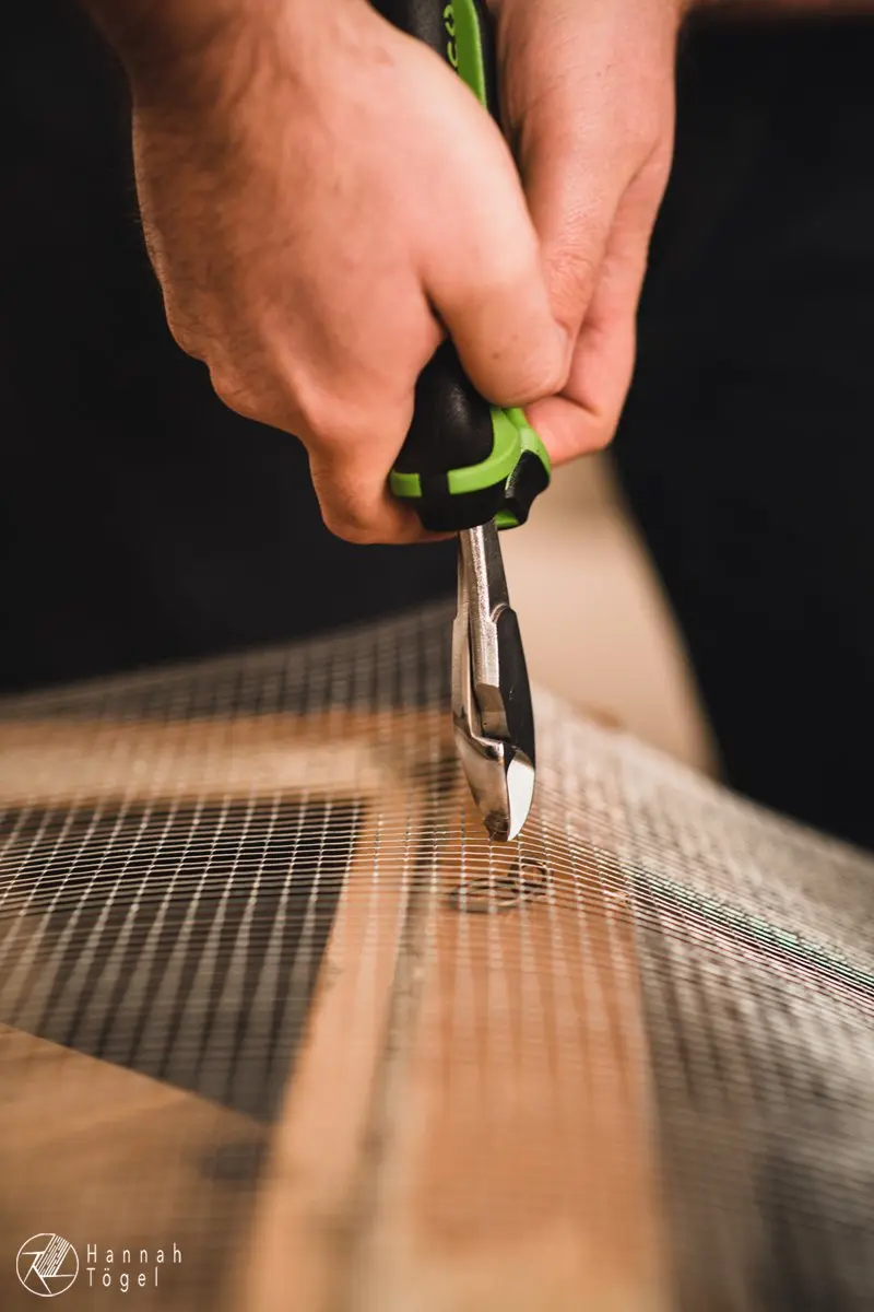Für diese Variante haben wir das Gitter zuerst zurechtgeschnitten und dann an die Rückseite getackert. Die 6x6mm Maschenweite des Drahtgitters ist ist eher klein, deswegen am besten vorher seine Klammern abmessen und schauen, ob sich das auch wirklich ausgeht. Danach gehts schon ans Bilder auflegen und befestigen. Nach nur einer halben Stunde Arbeit, war ein großer Rahmen mit 19 Bildern auch schon wieder an der Wand.