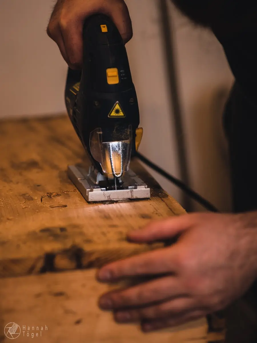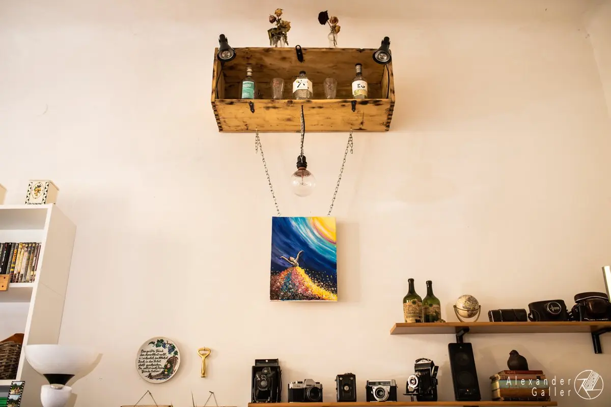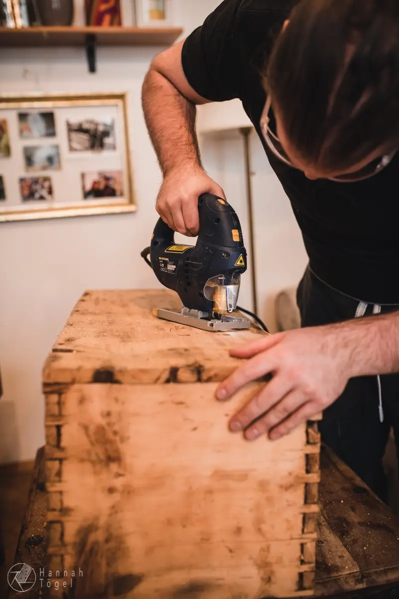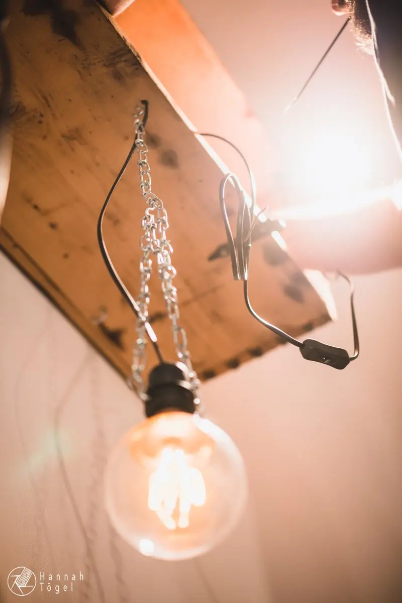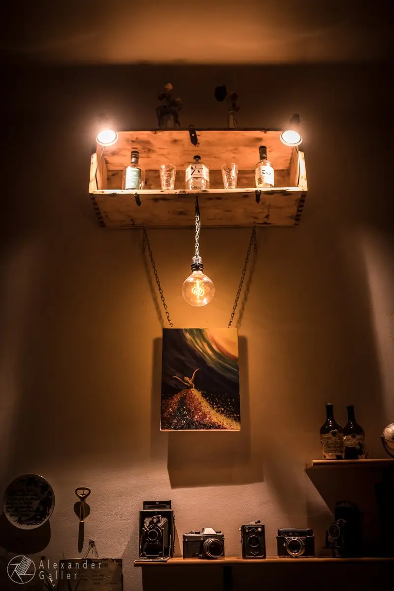 Zuerst haben wir die Füße der Kiste abgeschraubt und sie innen mit 4 Metallwinkel verstärkt. Nach dem Ausmessen der Position kamen der Ausschnitt für die Steckdose und die Löcher für die Befestigung in die Kiste. Glücklicherweise war an der Stelle wo die Kiste hinkommen sollte, ein Stromauslass in der Wand und wir konnten diesen für eine Steckerleiste verwenden. Noch vor dem Aufhängen kamen 2 Haken für das Bild, eine Bohrung in der Mitte für das Kabel der Lampenfassung und ein weiter Haken für die Kette, welche die Lampenfassung halten sollte in das neue Regal. Nachdem es mit 3 Schrauben an der Wand befestigt war ging es nun ans Lampenmontieren, Kabelverstecken und Dekorieren. Mit alten Gläsern und Flaschen, sowie getrockneten Rosen bekommt das neue Regal einen "alten"-Look. Außerdem lassen sich die Lichter mit einer Fernbedienung praktisch von der Couch aus Ein- und Ausschalten.