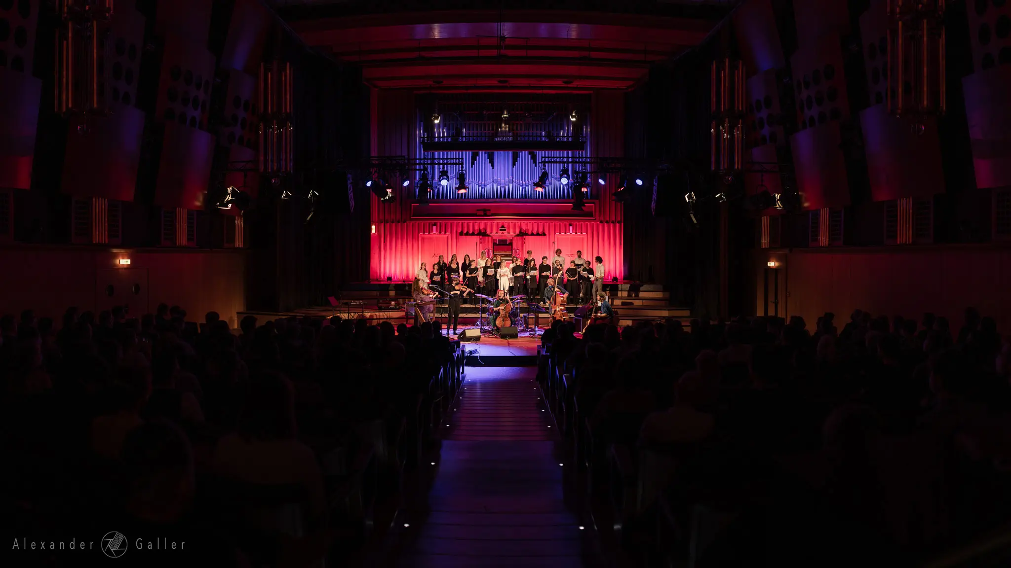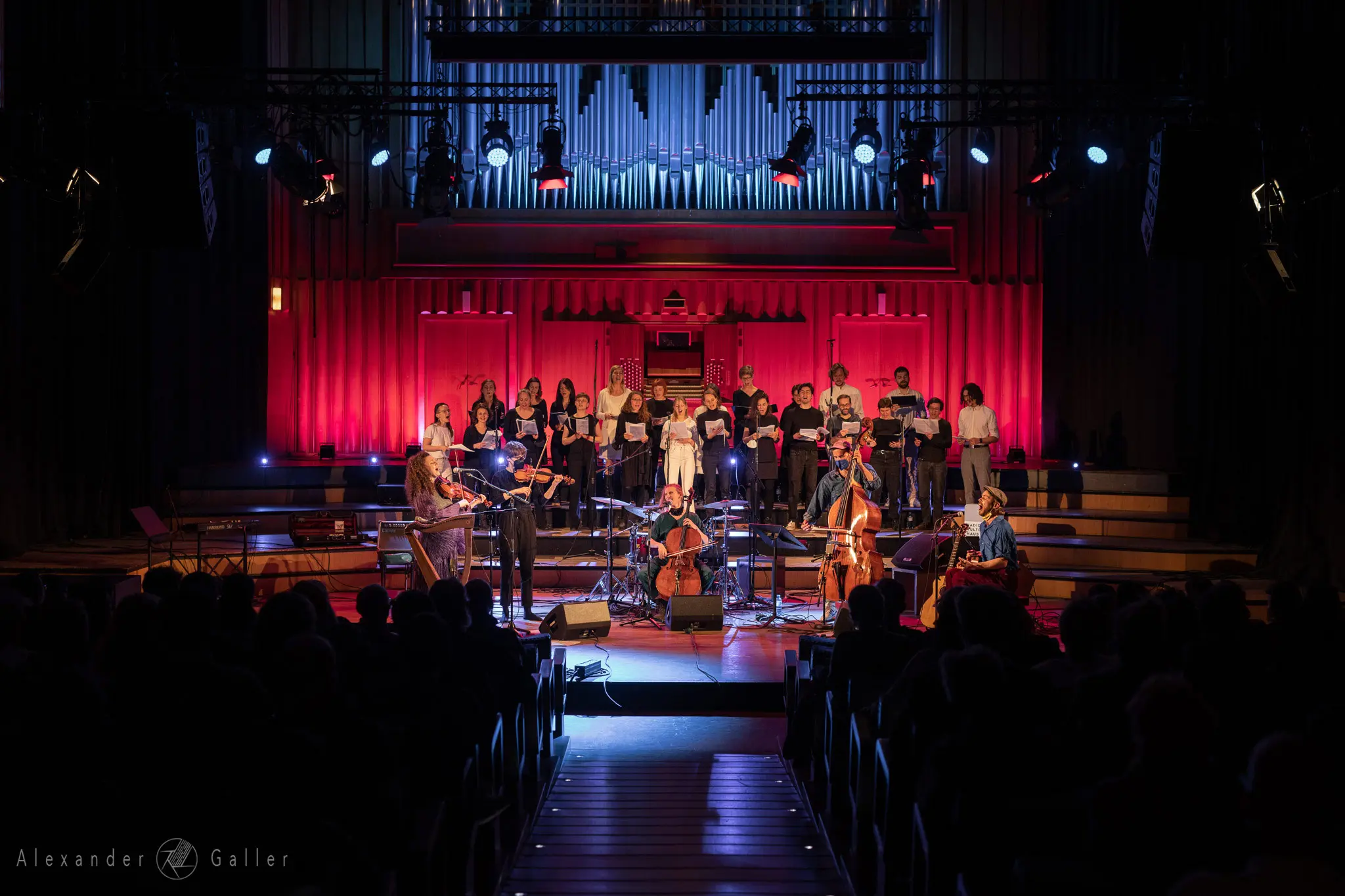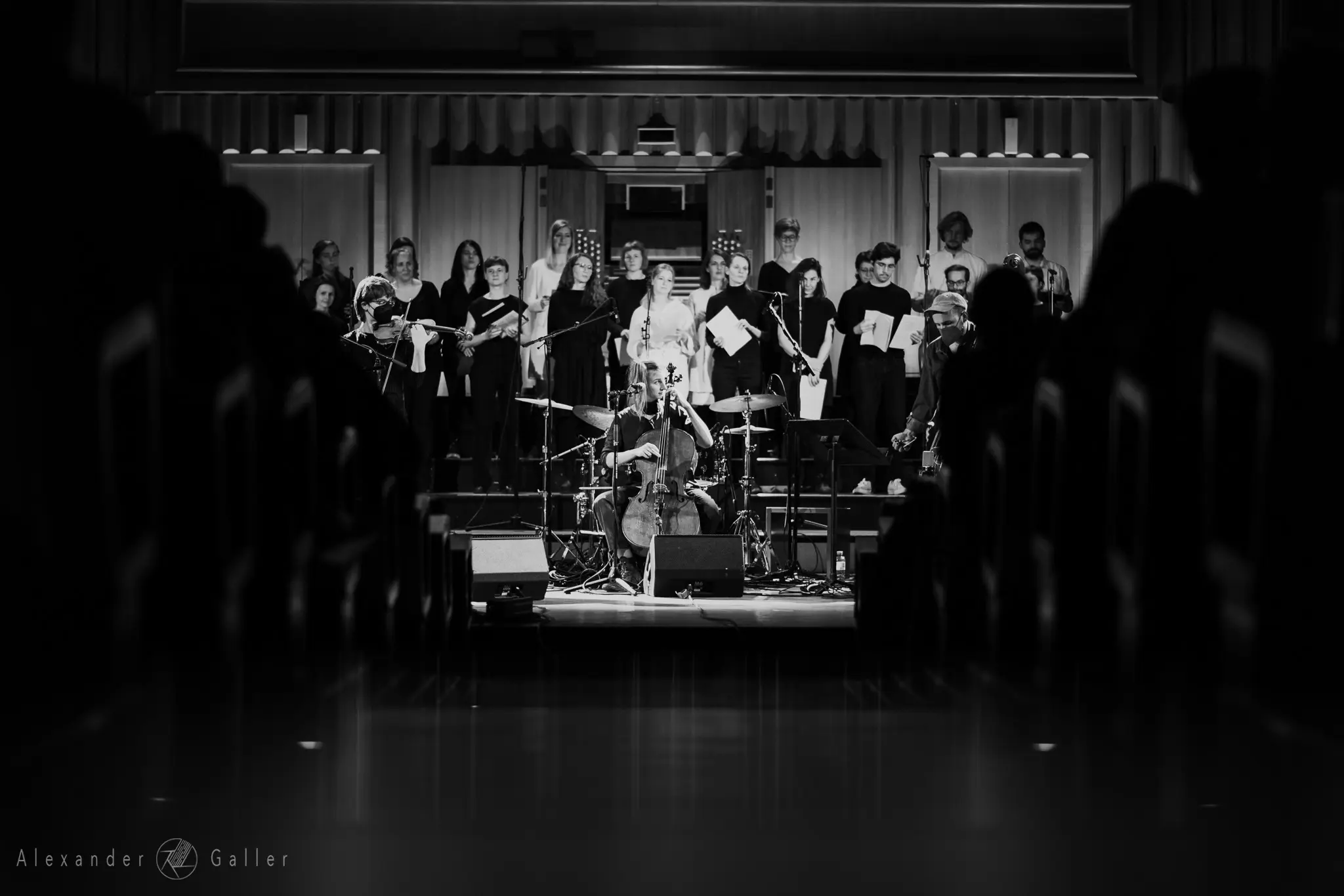 ...und Alpine Dweller dann die Bühne betritt, kann es nur ein magischer Abend werden.Das Wiener Indie-Folk Trio hatte bei ihrem Auftritt kräftige Unterstützung von Tobi am Kontrabass und als Rückenstärkung den Subchor und Chor X.