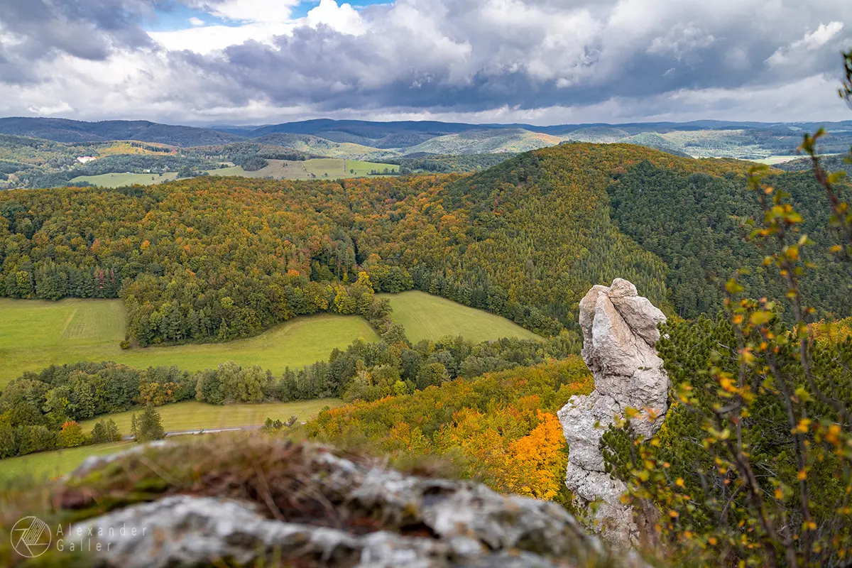 Diese Wanderung startet am Parkplatz beim Gasthof am Holzschlag, bei welchem wir uns natürlich, und das schon mal vorweg, fantastisch saisonal und regional, nach der Wanderung gestärkt haben. Vorbei bei diesem und rechts in die Siedlung geht es weiter in einen wundervollen Laubwald. Nach einem kurzen Anstieg ist man dann auch schon bei der Ruine, von der aus man einen tollen Ausblick hat. Unterhalb befinden sich Höhlen und auch gut besuchte Kletterspots. Wir machten noch einen Abstecher zum Peilsteinhaus. Dort steht eine Aussichtsplattform, von welcher man noch einmal einen wunderschönen Rundblick hat. Danach ist es nicht mehr weit zum Ausgangspunkt und zur wohl verdienten Stärkung.