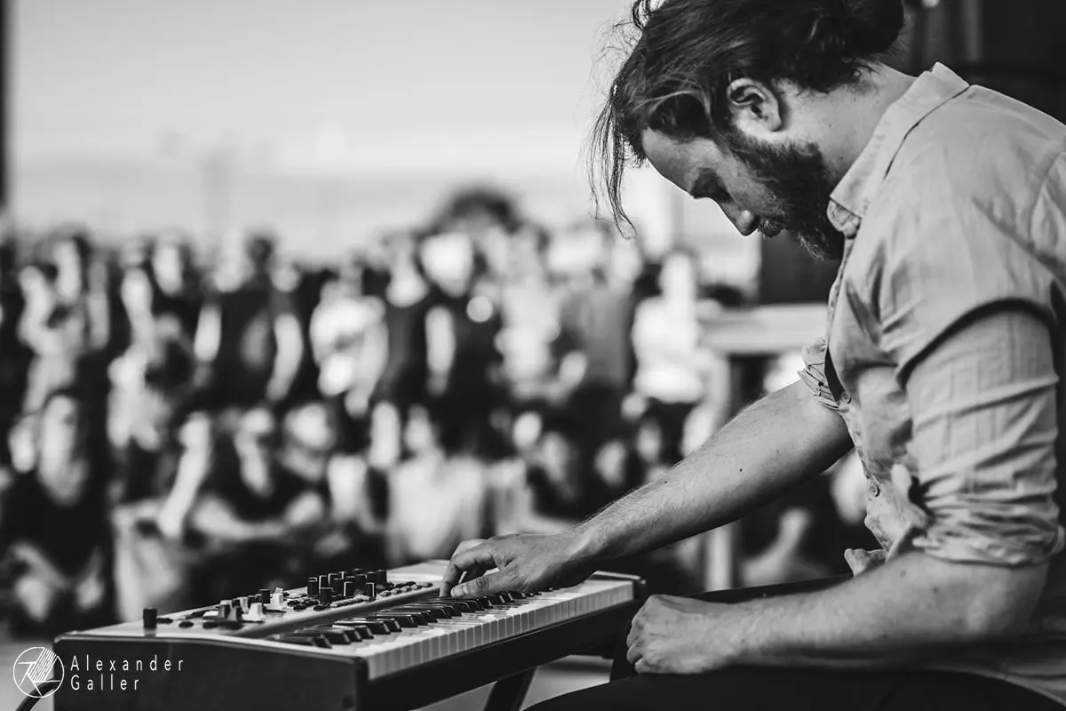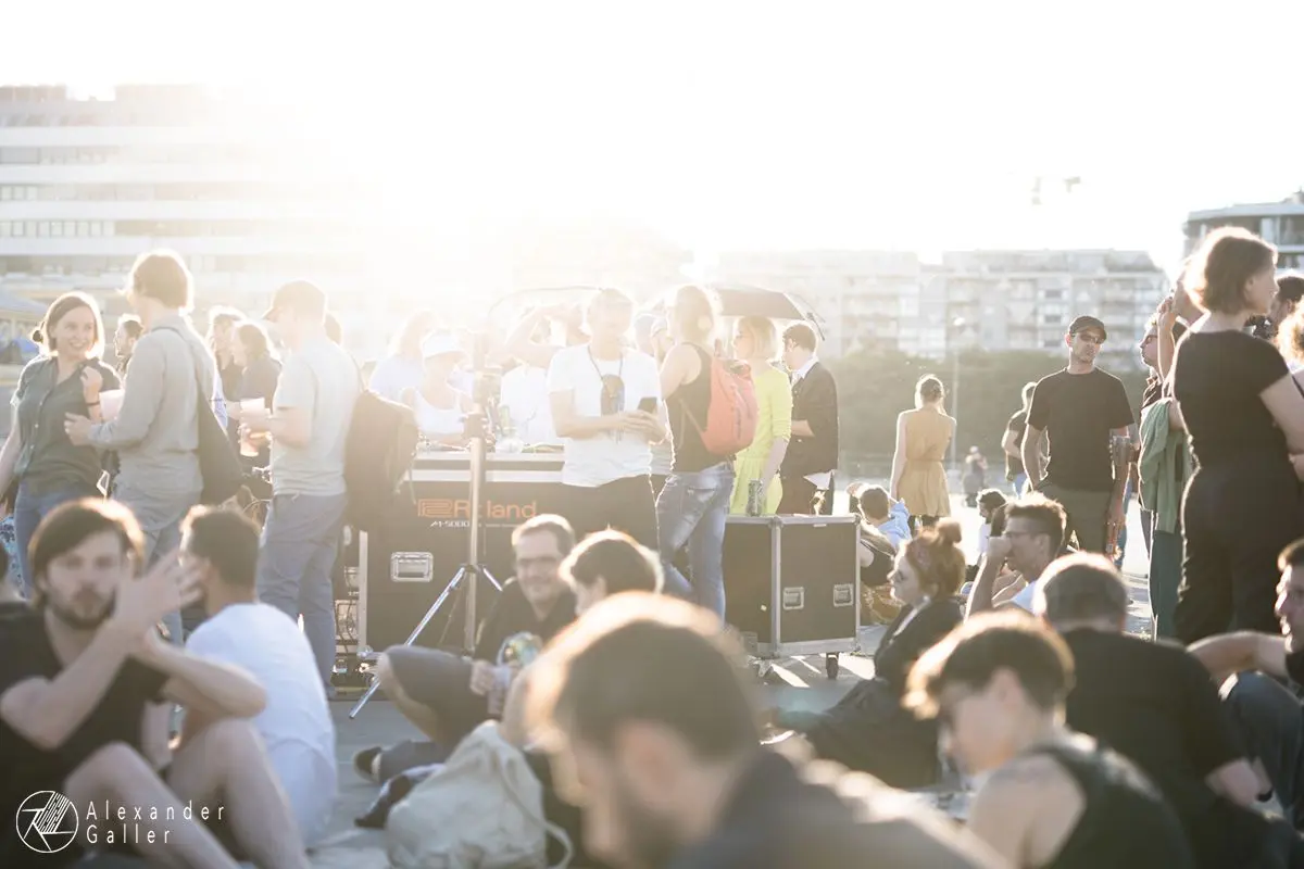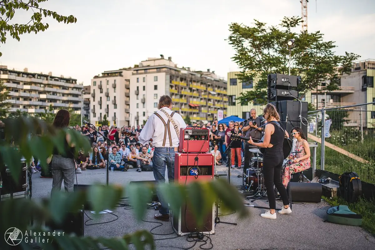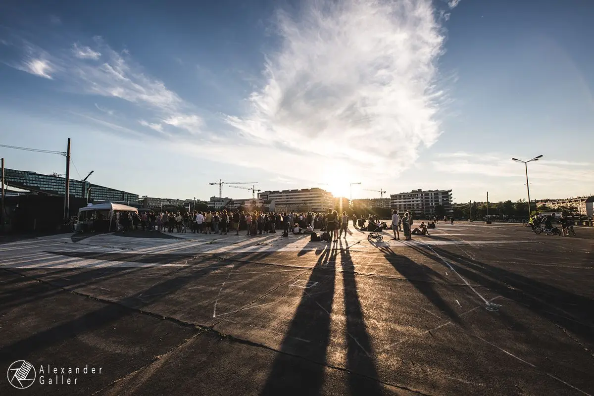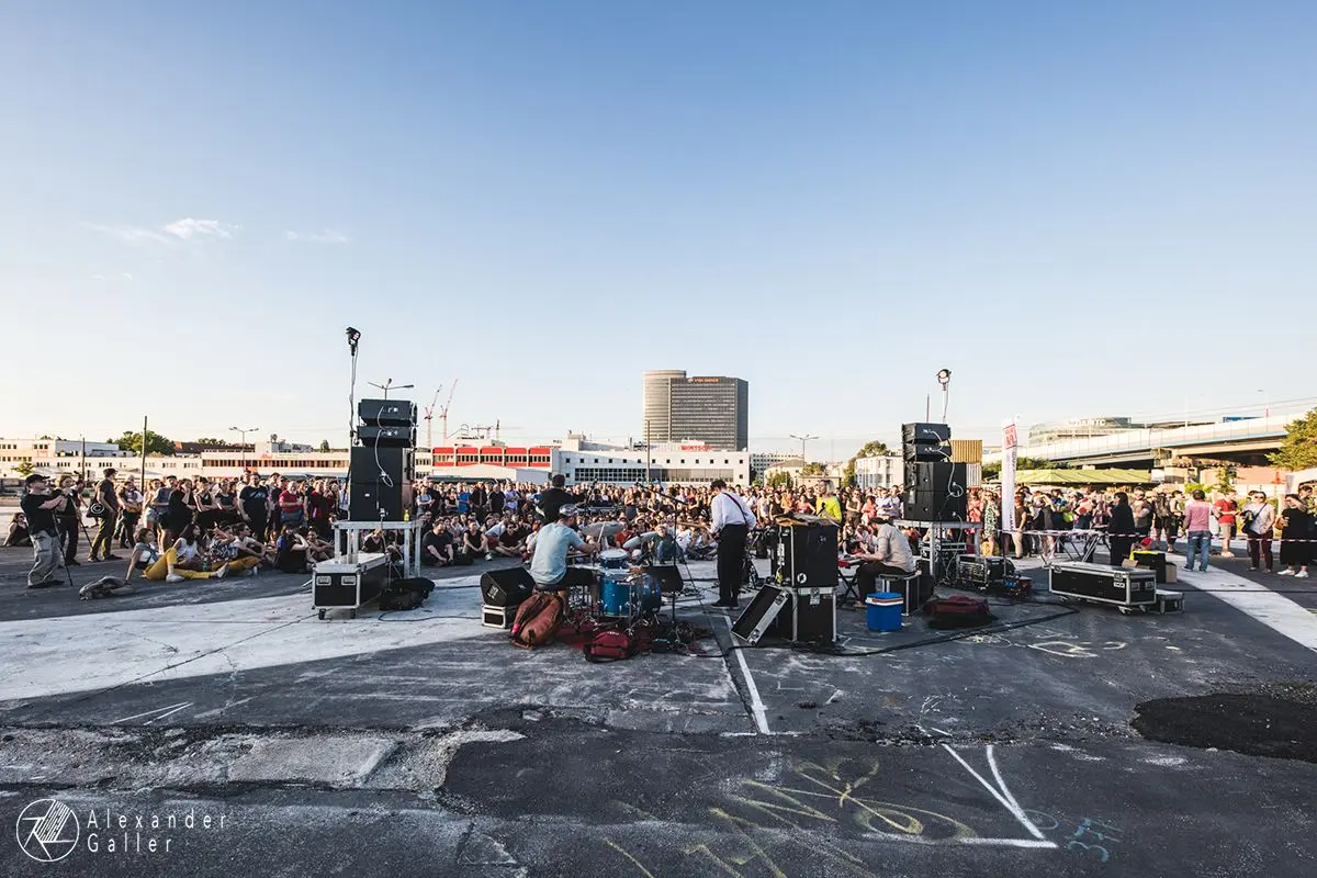 Das Baulücken-Konzert #13 bespielte die österreichische Avantgarde-Pop-Band 5K HD. Auf einem riesigen, leeren, urbanen Platz, die Tangente an der linken Seite, im Rücken die Marx-Halle und das T-Center und rechts das markante Gebäude der MA 60, spielten sie die Gäste in den Sonnenuntergang. Mit ihrem unverwechselbaren Sound, einmal einfach poppig und dann wieder höchst komplex, sowie den anspruchsvollsten Rhythmen und ausgereizten elektronischen Effekten, luden sie die Menge zum Tanzen und Feiern ein und waren so ein perfekter Start in eine neue Woche.At the Baulücken-Konzert #13 played the Austrian avant-garde pop band 5K HD. At a huge, empty, urban site, with the expressway on the left, the Marx-Hall, as well as the, T-Center in the back and the striking building of the MA60 on the right, they entertained the audience deep into the sunset. With their distinctive sound, some parts poppy but then highly complex, as well as the most ambitious rhythms and maxed out electronic effects, they invited the audience to dance and made this evening the perfect start for a new week.