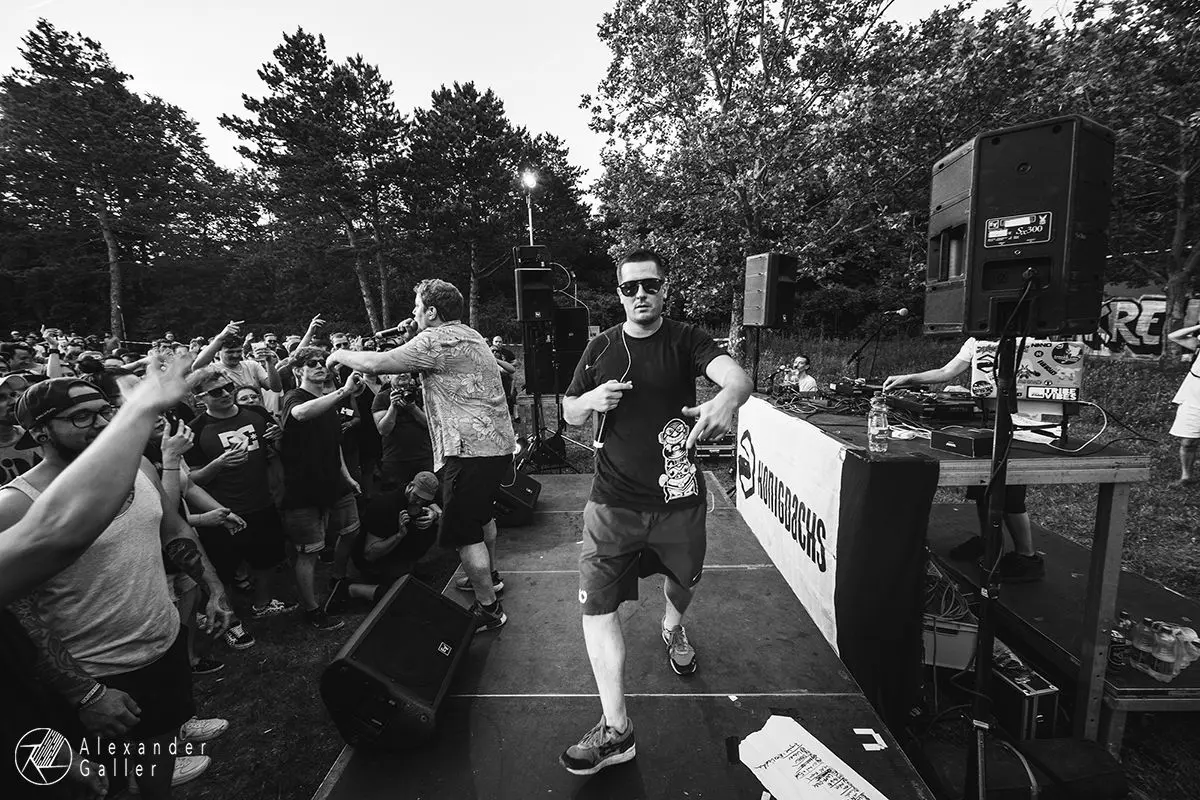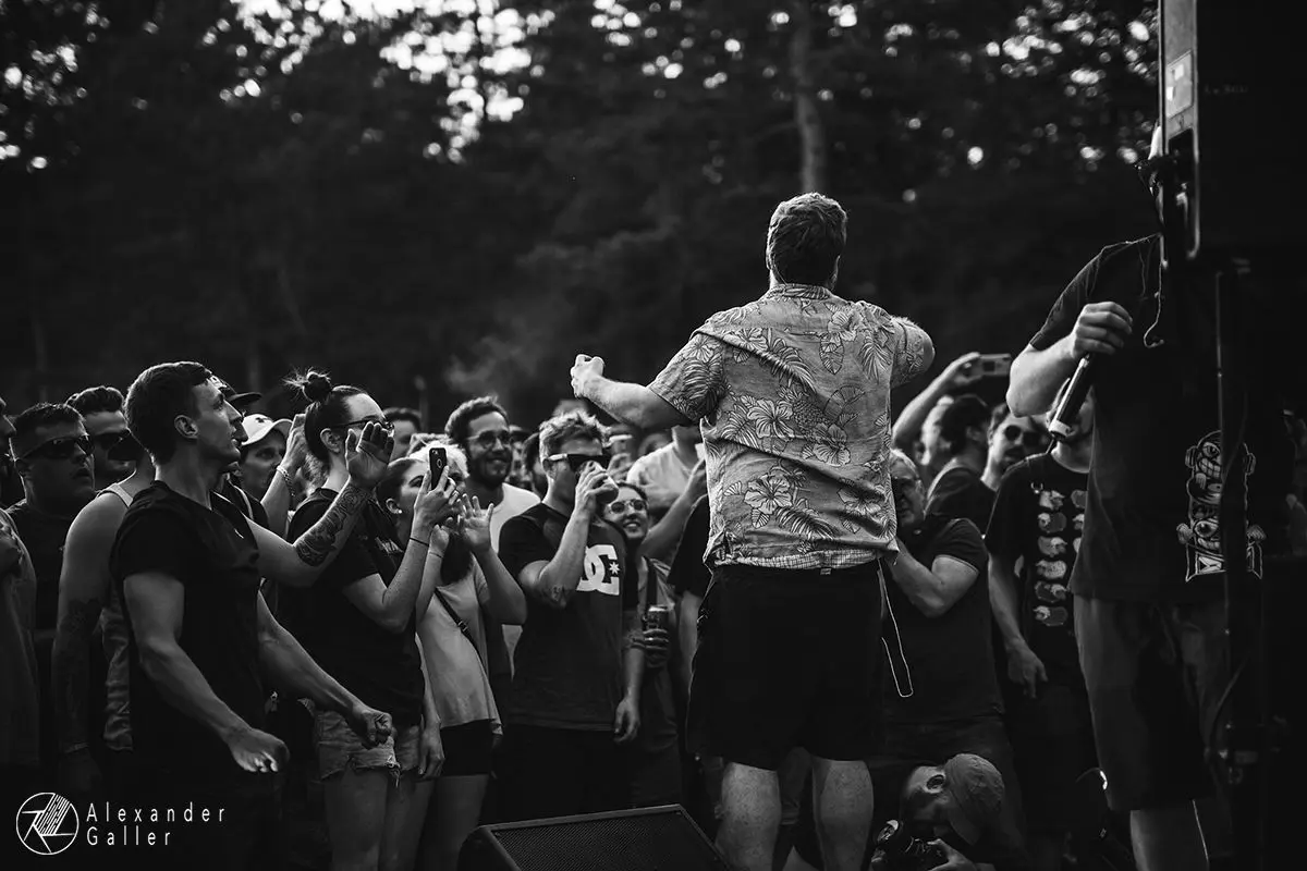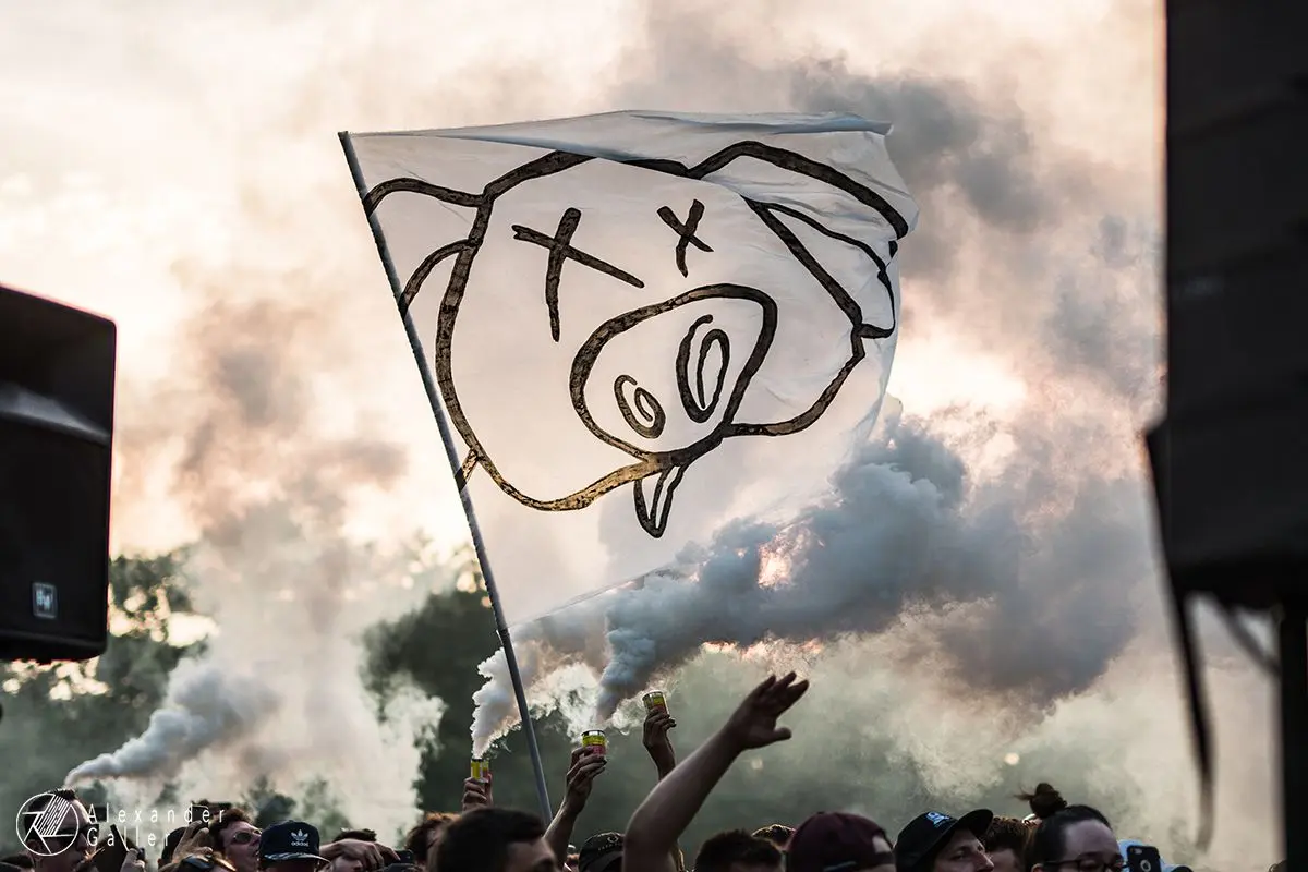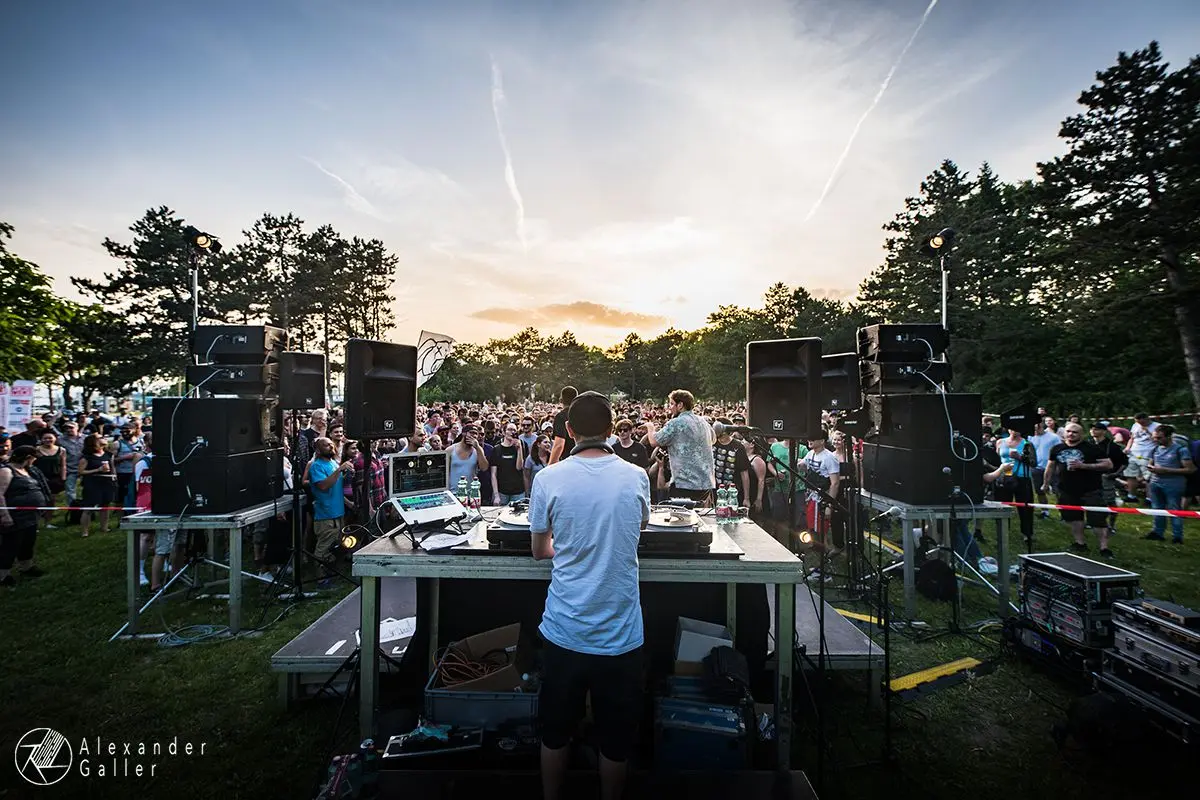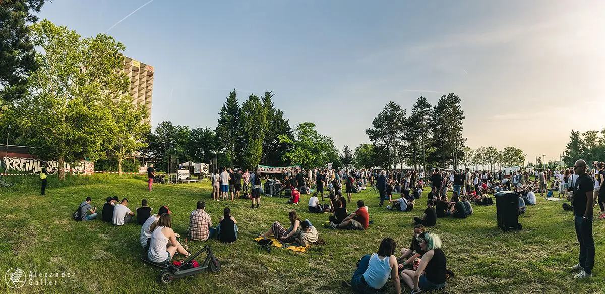 Mit dem Wappentier, dem Schweinehund auf der Fahne rockte das Wiener-Rapper-Duo Kreiml & Samurai das vierzehnte Baulückenkonzert. In der Baulücke zwischen der Therme Oberlaa und dem alten, entkernten AIRO Tower Hotel wurde den in Scharen gekommenen Fans der Konzertreihe von Oliver Hangl, im Rahmen des WIR SIND WIEN.FESTIVAL DER BEZIRKE einiges geboten. Von Rauchfackeln bis Freestyle-Rap konnte das Duo aber vorallem mit den sehr aktuellen Texten und einer aktiven und ausgelassenen Bühneshow überzeugen. With their heraldic animal, the "Schweinehund", printed on their banner, the Viennese rapper duo Kreiml & Samurai rocked the 14th Baulückenkonzert. In a gap between the thermal bath Oberlaa and the old, decentralized AIRO Tower Hotel, the huge amount of attending fans was offered a lot at the concert series by Oliver Hangl, in the course of the WIR SIND WIEN.FESTIVAL DER BEZIRKE. The Duo convinced with elements like smoke flares and freestyle rap, but particularly with their up-to-date lyrics and a very high-spirited stage show.