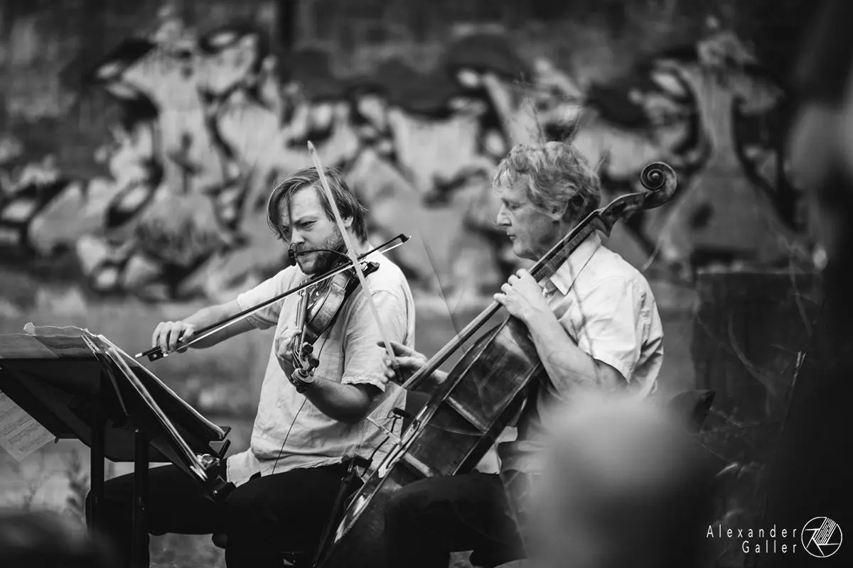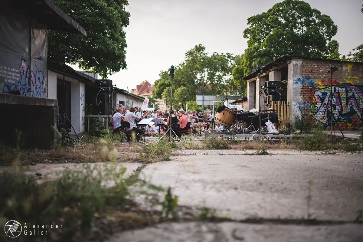 Das Klangforum Wien beehrte das Baulückenkonzert #15 in einer Baulücke eines aufgelassenen Baustofflagers. Mit zeitgenössischer Musik à la Arnold Schönberg war das Klangforum ein perfekter Kontrast zu der Wiener-Rap-Crew Kreiml & Samurai beim vorigen Konzert. Mit verschiedenen Ensembles, aber auch Solostücken wurde das Publikum in einen wunderschönen Sonnenuntergang begleitet.The Klangforum Wien honored the audience at the Baulückenkonzert #15 with their presence and an empty site of an abandoned construction material storage. With contemporary music à la Arnold Schönberg, the Klangforum was the perfect contrast to the Viennese rap-crew Kreiml & Samurai, who played at the previous concert. With various ensembles, but also solo pieces, the audience was escorted into the sunset.