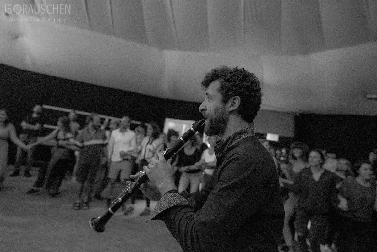 The Italian trio with guest players managed to draw in the dacing crowd from the grounds of the Creau to the pavilion. With their "Klezmer poetry and Balkan dances" they invited the visitors to participate at their energetic show. With instruments, typical for traditional music of Ashkenazic Judaism, like the accordion, the violin or the clarinet, they opened the letzt FirleTanz of the season with magical melodies.