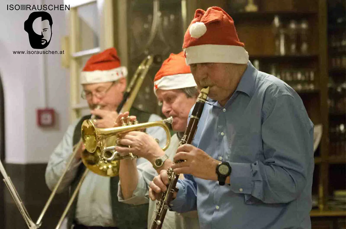 Mit Jazzstandards wie Ja-Da (Ja Da, Ja Da, Jing, Jing, Jing!) oder Nagasaki und Interpretationen von traditionellen Weihnachtsliedern wie O Tannenbaum und Oh du fröhliche im Chicago-Stil wurden wir musikalisch auf sehr hohem Niveau unterhalten. Hausgebeizter Wildsaibling mit Dillobers, Maronensuppe mit Whisky verfeinert und Zimtcroutons, Hirschmedaillons in Whisky Wacholderrahmsauce mit Kürbiskernfeingebäck, Rotkraut und Preiselbeeren und ein Duett von Zweierlei Whiskyparfaits mit hausgemachter Whiskypraline war das kulinarische Gegenstück und rundete dieses großartige Gesamtpaket ab.