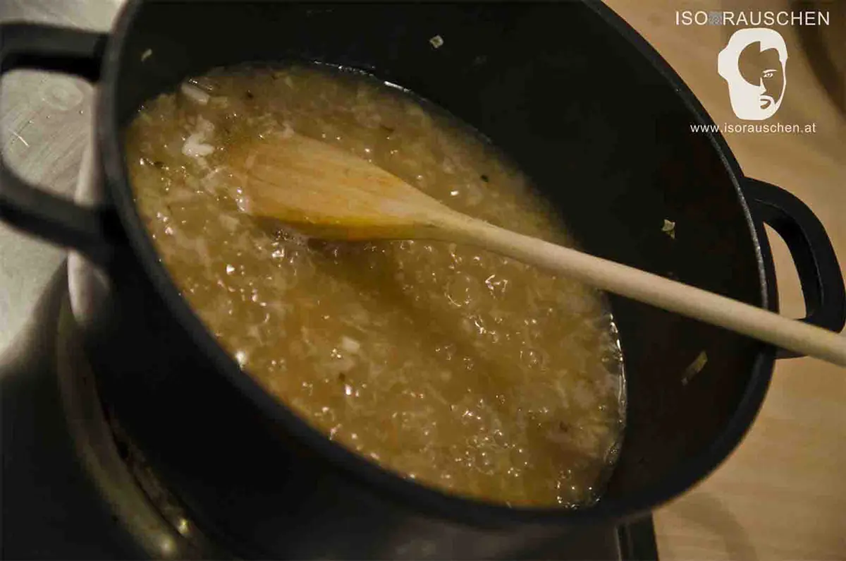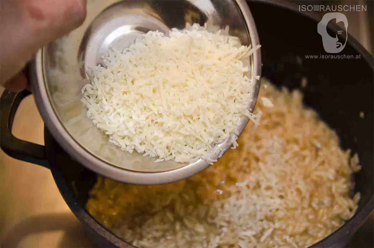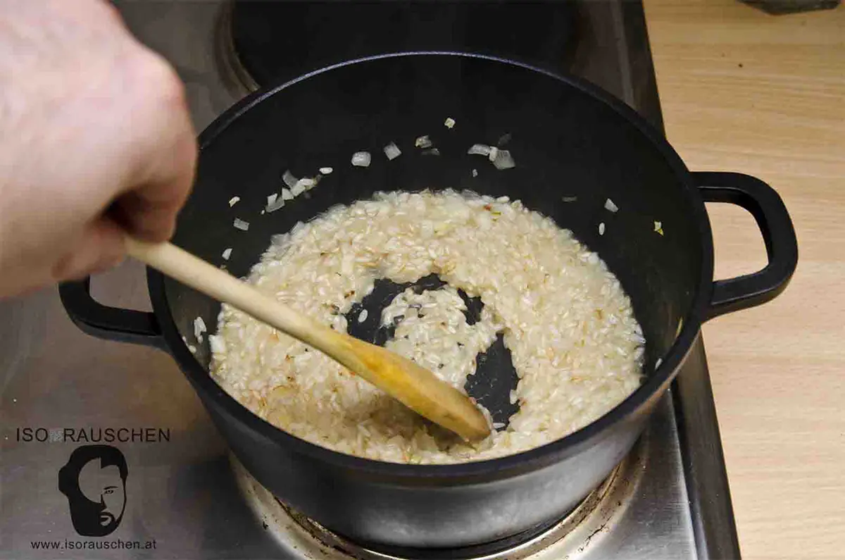 - Unter ständigem Rühren nach und nach Suppe zugeben. Der Reis sollte außen weich sein und innen noch etwas Biss haben.