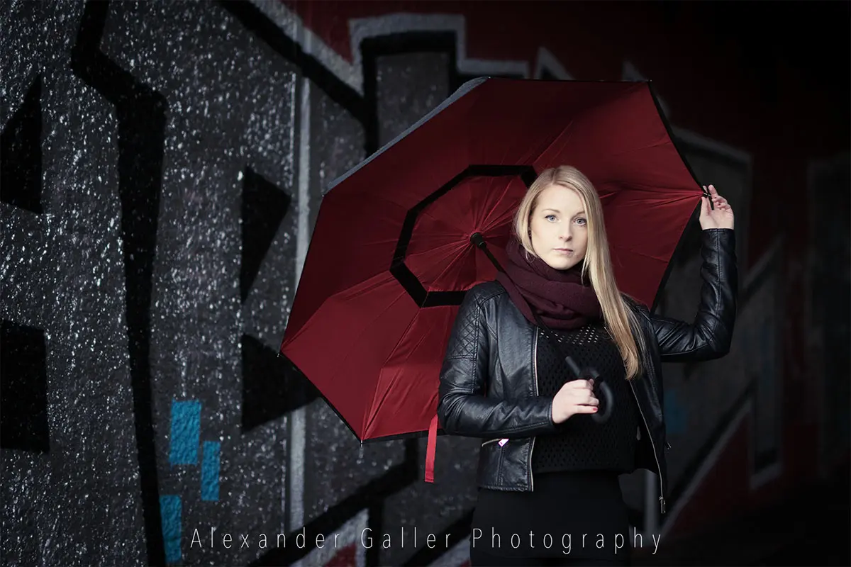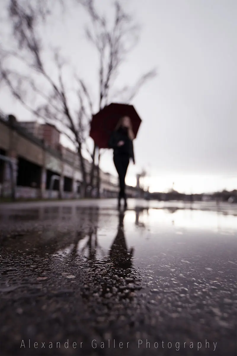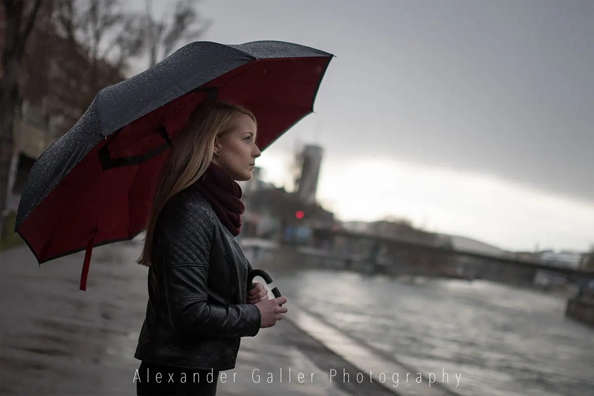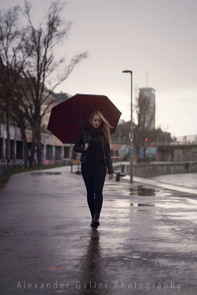 English versionBei Outdoor-Shootings ist man immer vom Wetter abhängig. So wollten wir auch dieses auf Grund des Regens verschieben, entschlossen uns aber es trotzdem zu machen, was meiner Meinung nach die richtige Entscheidung war.Die Lichtstimmung nach dem Regen, kurz vor dem Sonnenuntergang, war einfach wundervoll. Weiches, warmes Licht gab allem einen samtigen Schleier und schon fast surreale Farben. Der Regenschirm war das perfekte Accessories und der Donaukanal eine tolle Location.