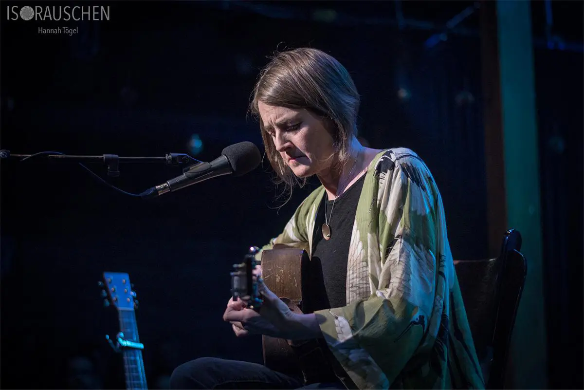 Karine Polwart eröffnete den Abend sehr traditionell. Ruhige, großteils auf der Gitarre gezupfte Lieder mit lyrischen Texten und ihre einzigartige Stimme nahmen das Publikum mit in eine eigene Welt. Zwei Höhepunkte waren das Lied mit ihrer Begleitung am Kalimba (Daumenklavier) und die musikalische Erzählung der Sage vom Zaunkönig.